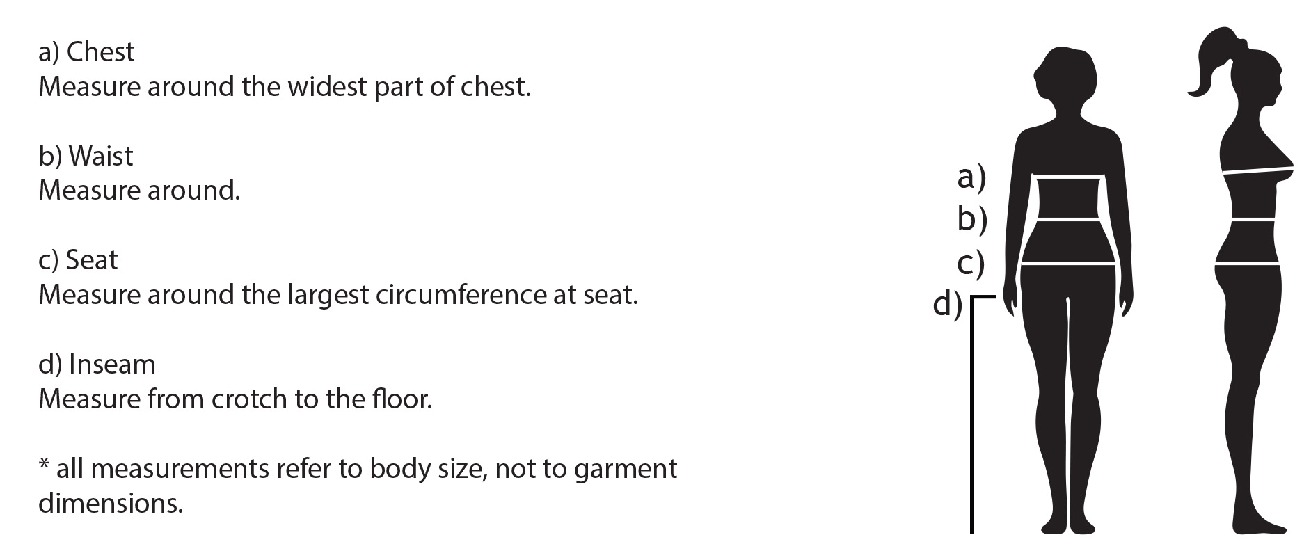 Below is the size chart for our products. Please note that all measurements refer to body size, not to garment dimensions. If you are in doubt, don’t hesitate to contact us.